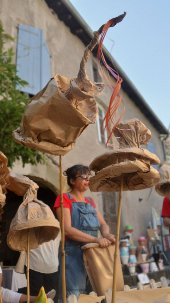Formés à l'art du "chapeau de papier" depuis plusieurs années, les Montreurs de Merveilles utilisent en priorité le papier kraft et le papier de soie pour leurs réalisations.