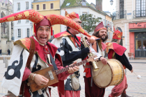 Ils arrivent par le pont et rentrent dan la ville. Sitôt sur la grand place, ils prennent la rue suivante toujours en mouvement. Leur musique gaie et rythmée passe de quartier en quartier. Le bouche à oreille est tellement rapide que toute la citée parle d’eux, alors qu’ils sont déjà loin. On entend encore leurs tambours, les trompettes, la cornemuse, les cordes et les sonailles…