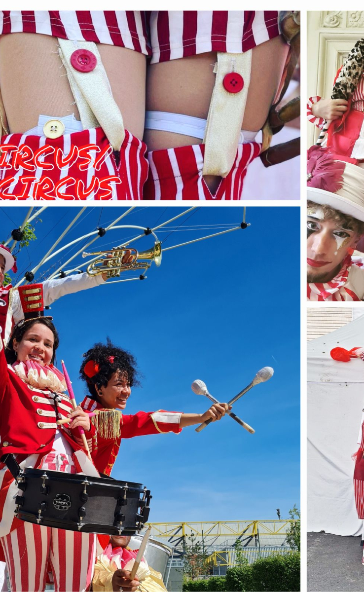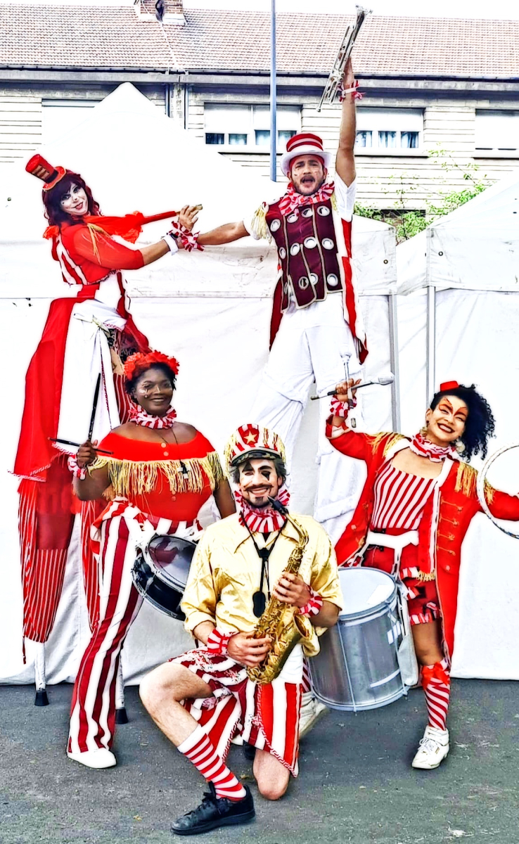 -Tam Tam Circus : Nous composons un ensemble de trois à quatre percussions et bien sûr nos échassières, nos contorsionnistes, monocyclistes, les duo, trio et autre artistes visuels selon votre choix pourront se joindre à cette troupe.