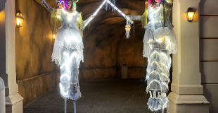 Approchez vous de nos échassières Festilumineuses, munies de leurs lumières blanches et colorées. leurs univers rejoignent l'esprit photographique de David Lachapelle. Leurs couronnes de fleurs évoquent les couronnes de l'avent symbole de vie éternelle. Le mélange des franges cousues sur leurs habits de lumière évoquent les costumes de danses latines.