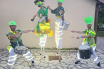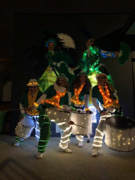 Les tropiques s'invitent dans votre événement. Les échassières danseuses aux couleurs du brésil sont accompagnées par une troupe de percussionnistes Samba-Reggae. Grâce à l'implication des personnages et aux jeux scéniques, chorégraphiques et les animations, la troupe interagit avec le public. Nous avons imaginé cette déambulation aux lumières de la couleur du drapeau brésilien : vert, jaune, bleu et blanc. Suivez nous de loin et aussi dans la nuit tombante de l'été ou pendant les fêtes de noël placées sous des thèmes tropique.