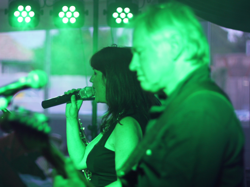 Elysa au chant et quelquefois au saxophone et Dom à la guitare et au chant.
