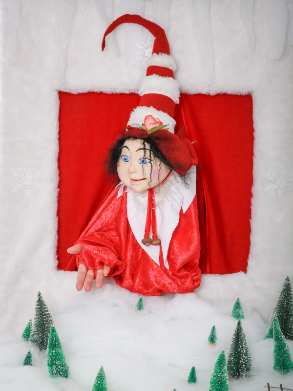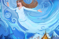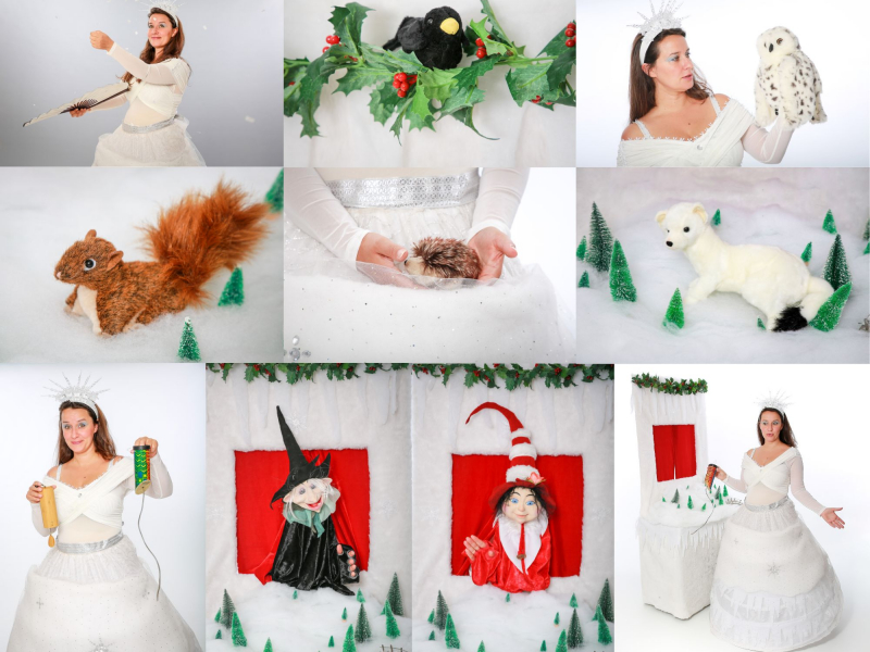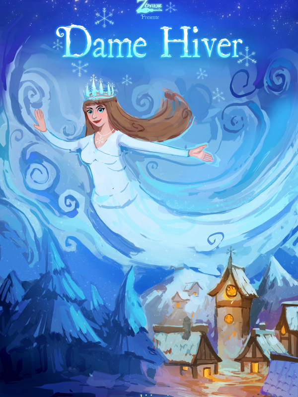 Conteuse et musicienne du grand froid, mais aussi protectrice des petits animaux qui ont trouvé refuge dans sa robe enneigée.