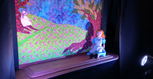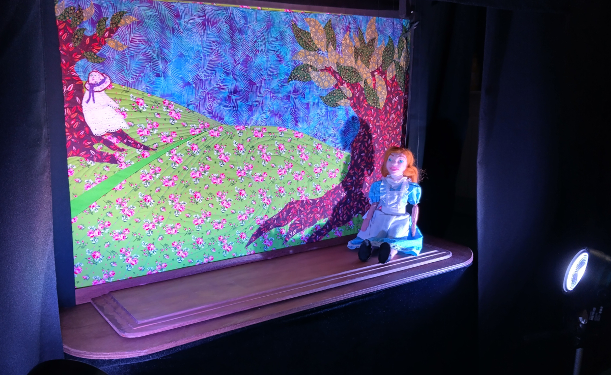 Les marionnettes à fils sont en laine cardée (sculptées à l'aiguille) et tissus, et évoluent devant un décor en patchwork se déroulant façon Kamishibaï tout au long du spectacle.