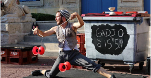 Gadjo est tout à la fois, dormeur, farceur, jongleur et rêveur. Il nous accueille chez lui, dans la rue, pour nous présenter son cirque éphémère. Dans un bric à brac d’objets récupérés, il construit sa scène et son décor pour ses numéros en tout genre. On découvre ainsi l’équilibre sur caisses de vins, l’envol de diabolos, la manipulation de boule en verre ou le fameux lancé de brosse à dents…