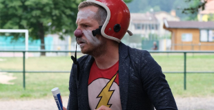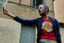 Un tube de dentifrice à la main, un clown se fraye un chemin.