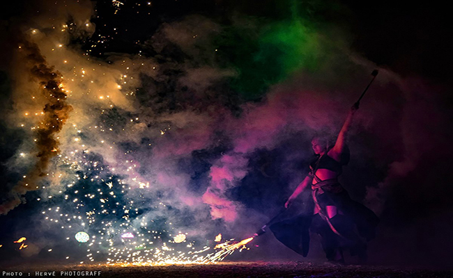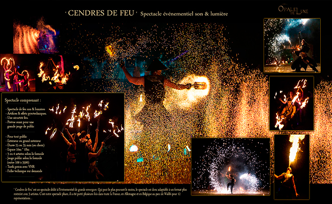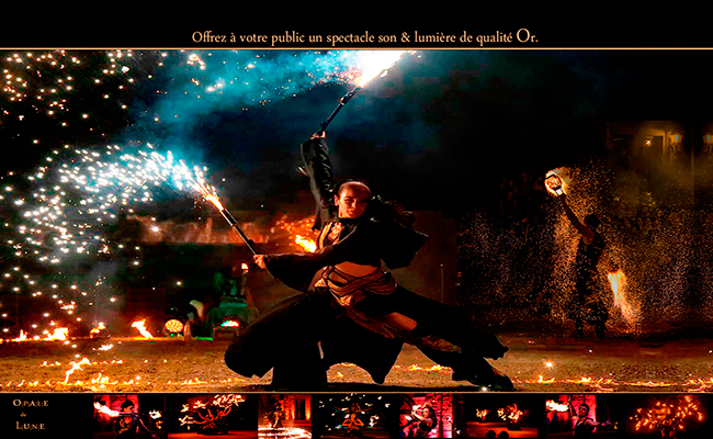 La compagnie Opale de Lune vous propose des danses enivrantes et sensuelles, des pluies de braises saupoudrées dans les airs, des volutes de fumées multicolores, des multitudes de flammes dansantes ponctuées d'effets pyrotechniques, Laissez vous emporter par l’incantation de braises, des danses et des performances de feu.