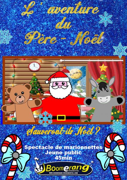 "Un jour avant Noël, le Père Noël s'aperçoit de la disparition des lutins et de tous les rennes. Accompagné d'un nounours hyperactif mais également d'un âne pas très futé, ils vont partir tous ensemble à l'aventure dans les plaines enneigées du Pôle Nord ! Le chemin va se montrer complexe, il sera semé d'embûches, mais avec l'aide des enfants présents dans le public, peut-être réussiront ils à les retrouver et à sauver Noël...