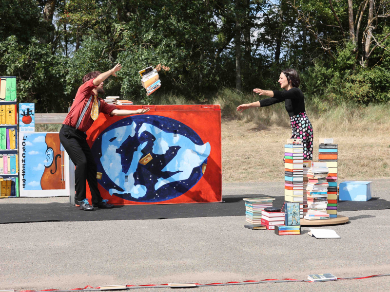 Une réflexion sur l’importance de l’écriture, du livre et de la lecture, pour susciter l’envie d’en tourner les pages. Nos deux protagonistes vont utiliser les différentes disciplines des Arts du Cirque pour magnifier le livre sous toutes ses formes (jonglerie, équilibres sur les mains ...).