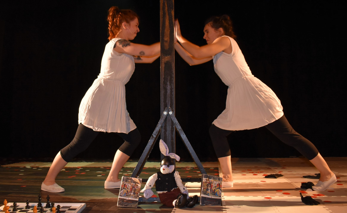 La scène est un grand jeu d’échec aux cases noires et blanches, c’est le monde merveilleux d’Alice dans lequel elle entre en passant à travers un miroir. Elle rencontre alors son reflet, « Alice Bis » avec qui elle va vivre d’étranges aventures. C’est une création d’une heure environ qui peut être jouée en salle comme en extérieur. La compagnie Les Enfants Sauvages peut être autonome en technique son et lumière.