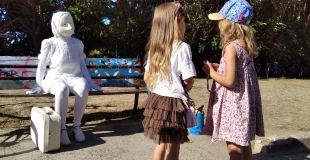 A leur tour, elles regardent les humains de toute taille, observent leur gestes, leurs émois, les écoutent silencieusement...et parfois un contact se crée, une interaction douce, une danse joyeuse...puis quand le moment est venu, elles ouvrent la valise et une surprise nous attend.