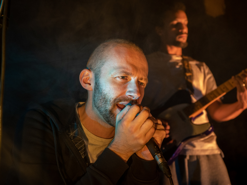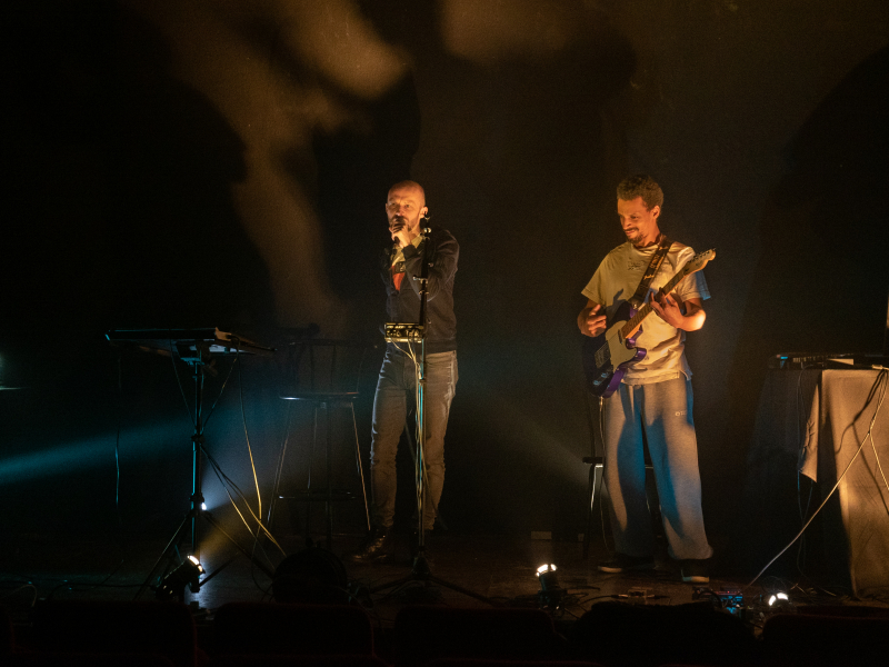 De son côté Idrissa contrôle le son et joue de la guitare, de la basse ou du clavier. Loopers et électronique rassembleront l'ensemble dans un concert aux tonalités sombres, mais que l'humour et la complicité des deux artistes sauront rééquilibrer pour un spectacle qui parlera à toutes les sensibilités.