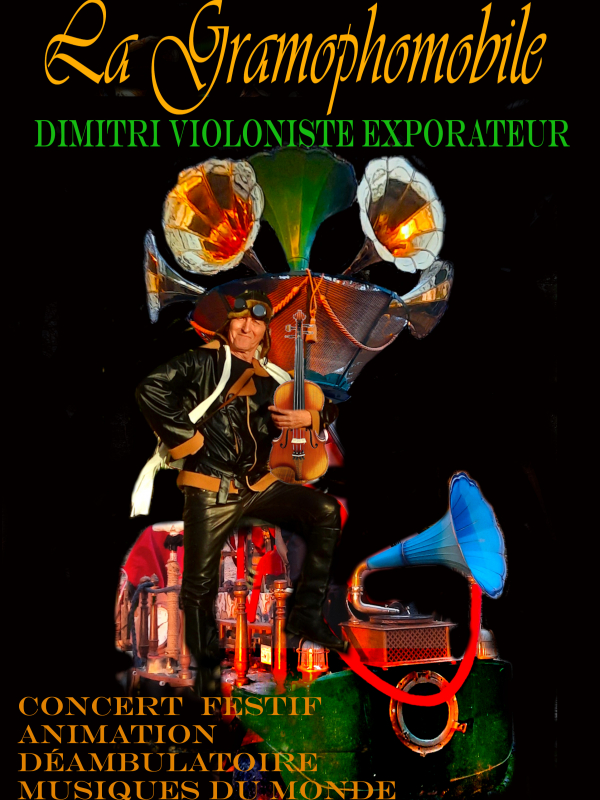 Dimitri violoniste explorateur à bord de sa Gramophomobile part à la découverte de vos villes, villages, festivals, marchés ou vides-greniers en donnant des concerts improvisés de musiques du monde tziganes classiques ou de films selon son inspiration. Un vaste répertoire allant du tango à la gigue irlandaise en passant par les valses viennoises et le french cancan d'OFFENBACH sans oublier les plus belles musiques de film de Nino ROTA Ennio MORRICONE ou Vladimir COSMA ainsi que des airs de virtuosités tzigane. Il place un 78 tour sur la platine de son gramophone amplifié qui lui sert de bande orchestre, il remonte la manivelle et joue en live. Tous les pavillons de la GGramophomobile se mettent à tourner et le pavillon central géant monte de 2 a 6m de hauteur diffusant la musique dans tout l'environnement. A la fin de chaque morceau Dimitri reprend le volant de sa Gramophomobile à la découverte d'un autre lieu comme s'il changeait de pays pour un nouveau concert improvisé. Les enfants et adultes peuvent monter à bord dans les déambulations.