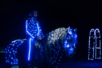 Pas de deux, entre le cavalier lumineux et la dame de lumière. La cavalière vêtue d’une grande robe à voile et en lumière vous transportera dans un univers romantique.