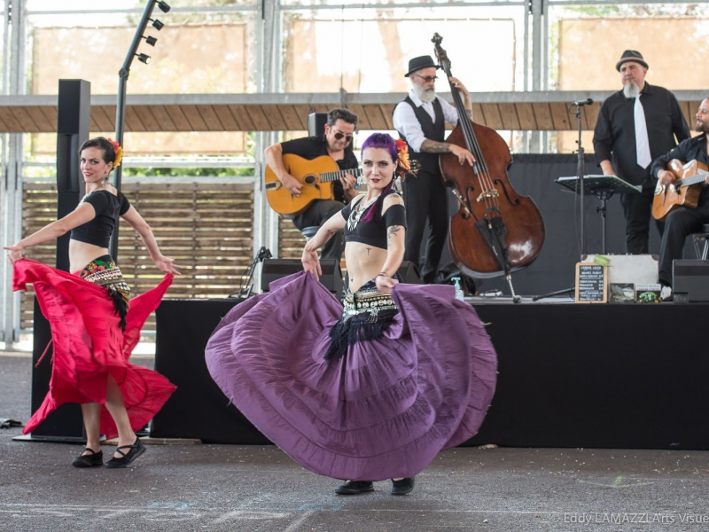 Cette déambulation est faite pour vous : les danseuses et jongleuses vêtues de costumes somptueux déferlent dans vos rues sur des musiques entrainantes. Elles dansent, ondulent et tourbillonnent pour votre plus grand plaisir. Danses tribales, orientales et flamenco se rencontrent. De plus, elles jonglent et manipulent toute une ribambelles d'objets visuels : hula hoop, éventails, tissu, ailes, buugengs, sabres et bien plus encore.