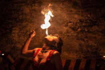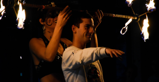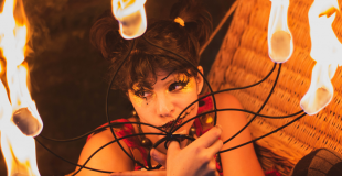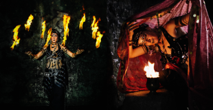 Voici Onyx, notre performeuse de feu spécialisé pour les scènes en intérieur et public adultes : avalage de feu, feu sur la peau mais aussi danse et jonglerie (bâton, épée, éventail, bolas, mains de feu..) et manipule aussi la boule de cristal dans des mouvements hypnotiques et gracieux, danse avec le fouet et joue avec les réactions du public avec brio.