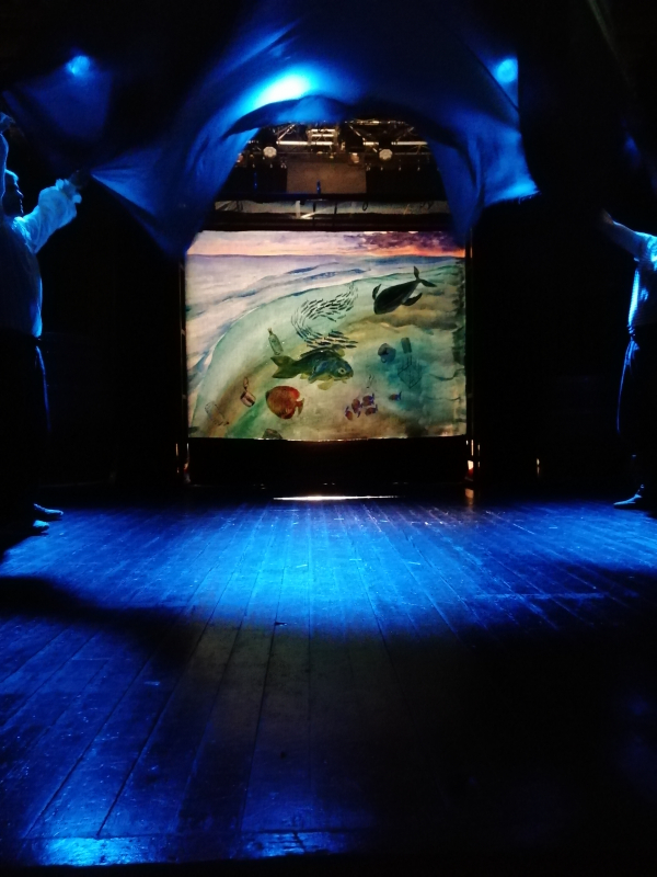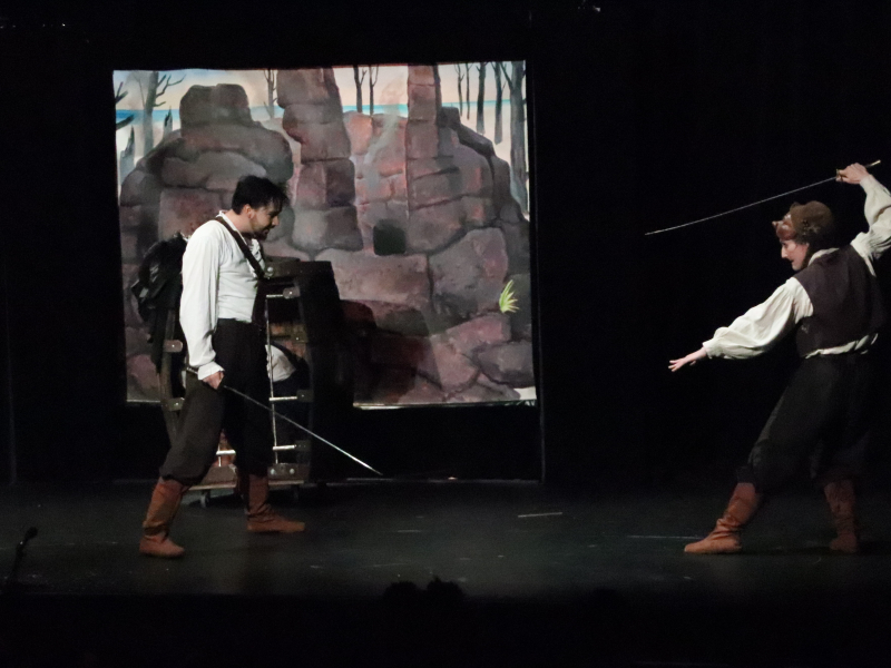 Frimousse et l'île aux perroquets est un spectacle pluridisciplinaire où se mêle combats, masques, musique et un décor en panorama mobile déroulant sur 20 mètres.