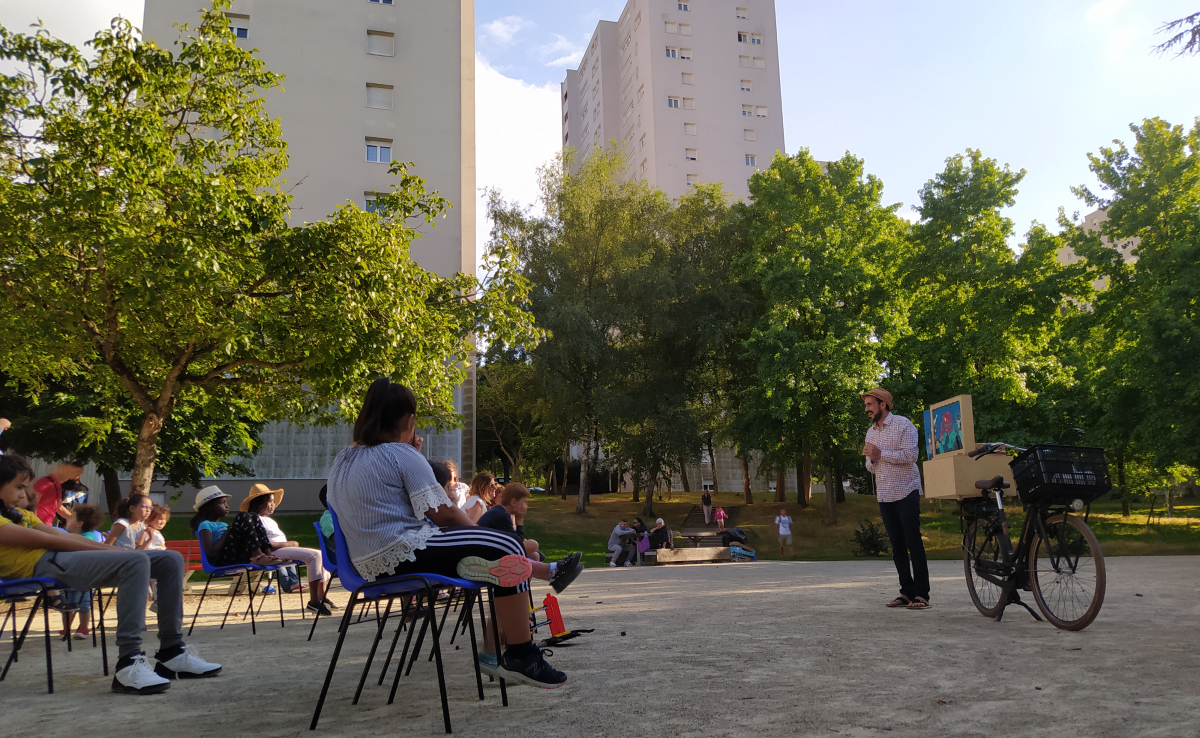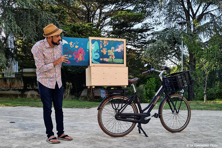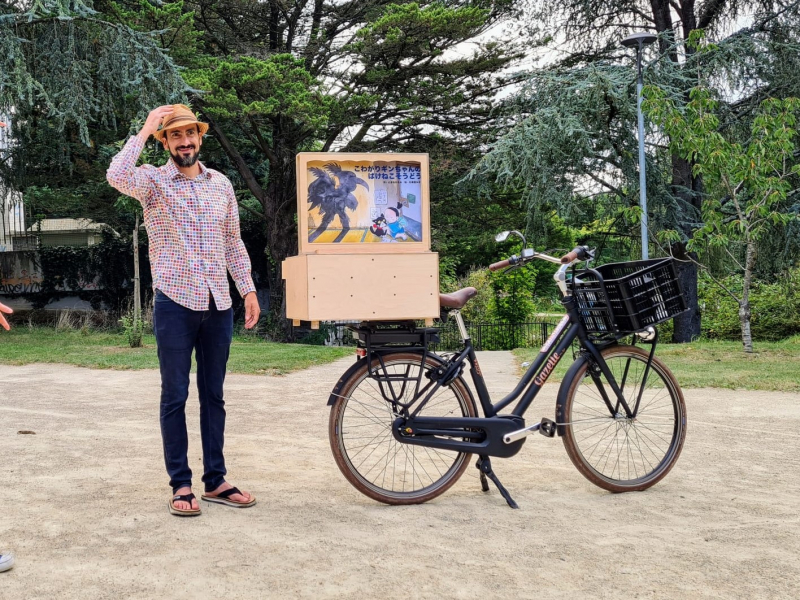 Grâce à son vélo-kamishibaï, le conteur va à la rencontre du public : dans un parc, sur une place ou au détour d’une rue.