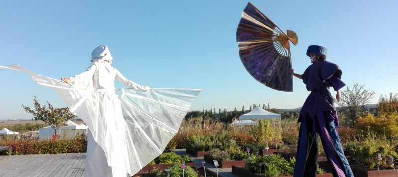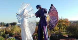 Issu d'une civilisation lointaine, les Mariés du Vent est un couple féérique, romantique noble et naïf. Rendant visite à votre évènement, il découvre votre public avec fraicheur et noblesse. Dans ce spectacle déambulatoire prônant l'amour, la comédienne, danseuse, échassière dansera avec son aile blanche géante. Le guerrier valeureux incarné par le comédien, jongleur, échassier manipule toutes sortes d'éventails géants (jusqu'à 2,5 M!), il jongle aussi avec différents rares instruments.