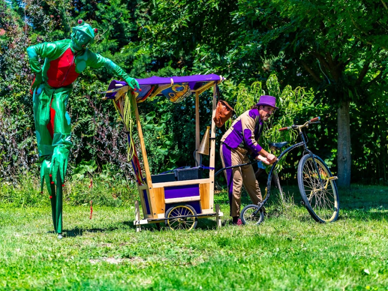 Le spectacle fixe de 40 mn pourra être précédé d'une déambulation sur échasses bien sur pour la grenouille et sur vélocipède grand-bi et charrette musicale pour le bonimenteur.