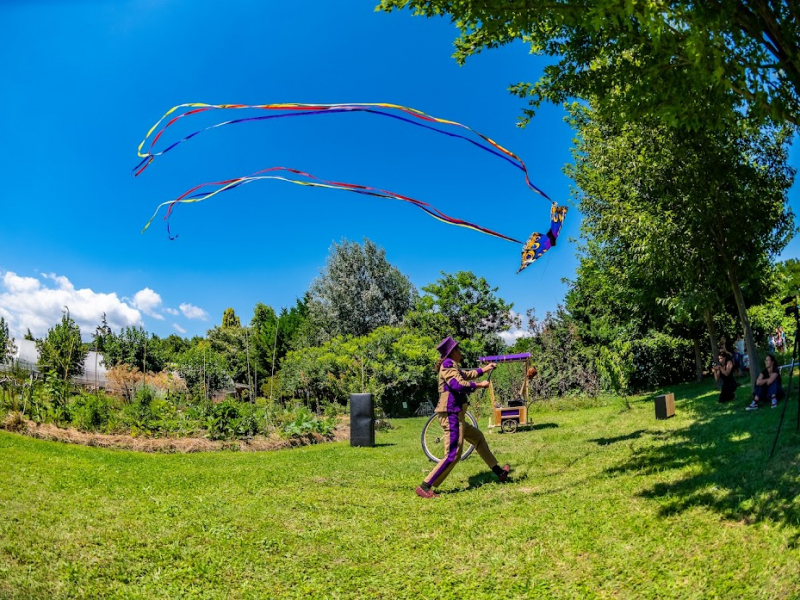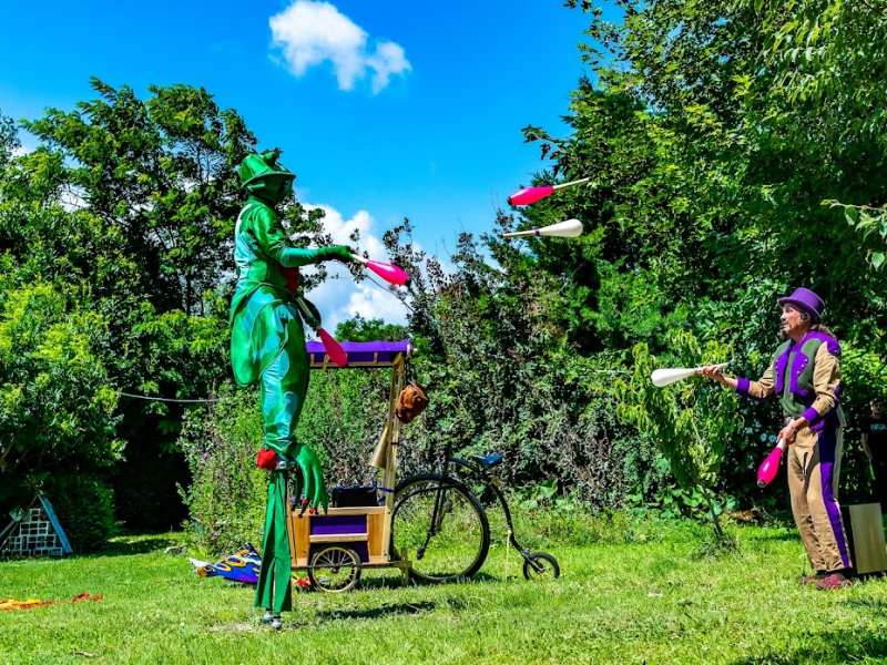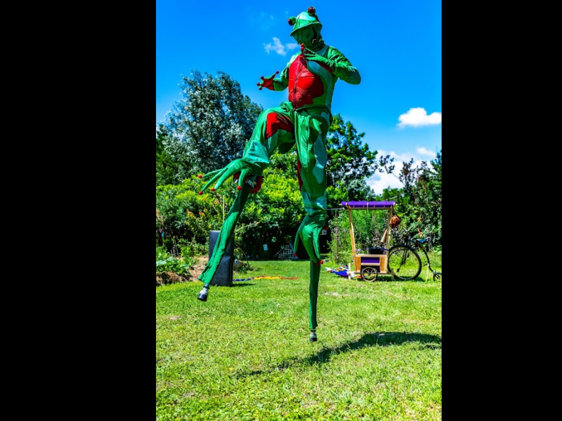 Ensuite l'improbable démonstration batracienne va surement déraper dans ce spectacle tout public qui enchaine cette théâtrale comique numéros de jonglerie et de prouesse d'échasses pneumatiques.