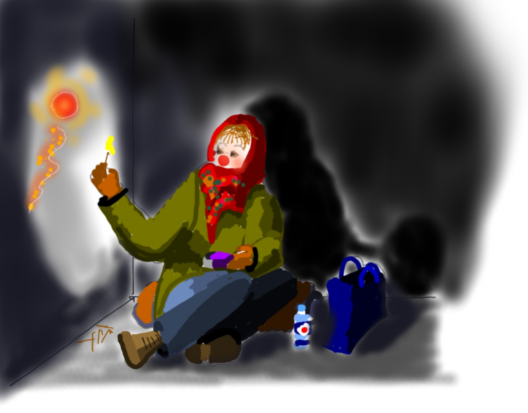 Le froid, la nuit, les décorations de Noël au dessus de nos têtes, les odeurs de vins chauds; de crêpes et une petite voix "Allumettes ! Allumettes ! Qui veut mes allumettes !". Vendre des allumettes en 2022, à l'heure des briquets, des chauffages de terrasses et du réchauffement climatique, quelle idée ! C'est celle de notre "clownette aux allumettes"! Pour survivre au froid, à la fin et à la solitude de la rue, la voici qui déambule avec son petit panier à l'affût de quelques rares acheteurs. Frigorifiée, déçue, elle se réfugie au pied d'un mur et essaie de se réchauffer en craquant ses petits morceaux de bois. Une des flammes s'envole et se matérialise sur le mur. La petite clownette intriguée va à sa rencontre...