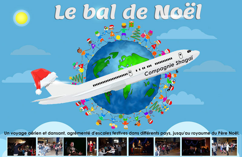 Le bal de Noël : de quoi s'agit-il ? C'est un bal pour enfants mais pas que ! Les chansons sont agrémentées d'une mise en scène dans laquelle nous "embarquons" les enfants avec comme destination : le pays du Père Noël... En effet, l'avion de la compagnie Shagaï est très spécial : il ne vole que grâce à l'énergie des enfants déployée lors des danses. Alors, il faut recharger les batteries à chaque escale...