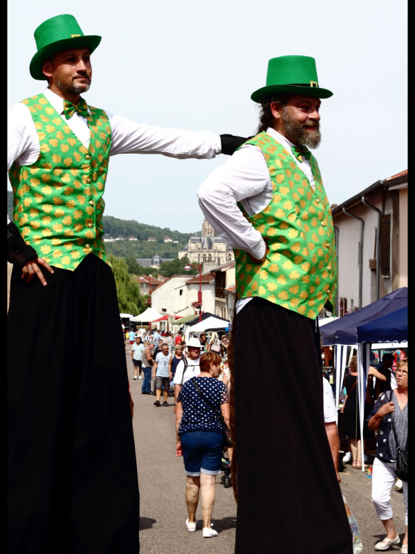 Les échassiers, se déplaçant avec une grâce aérienne, émerveillent le public par leur hauteur imposante et leurs mouvements élégants. Leurs costumes, inspirés de la tradition irlandaise, captivent l'attention.