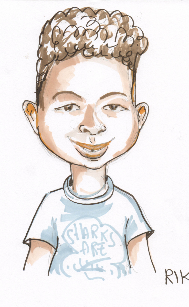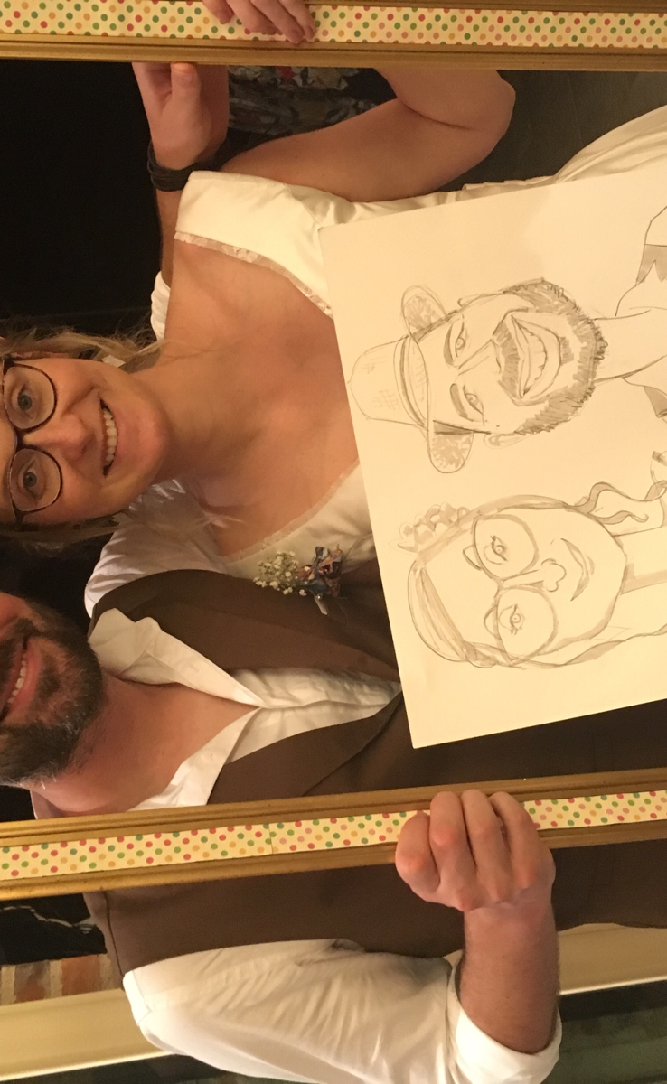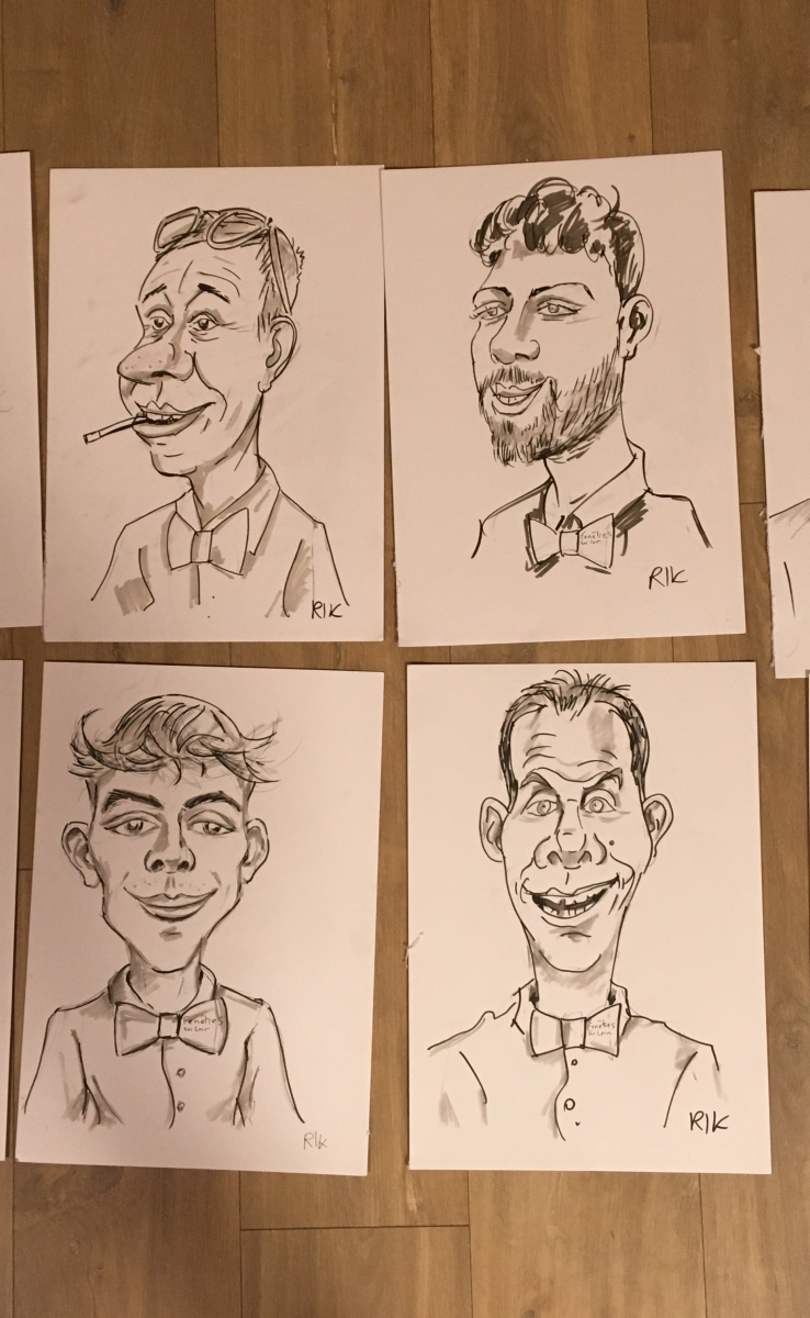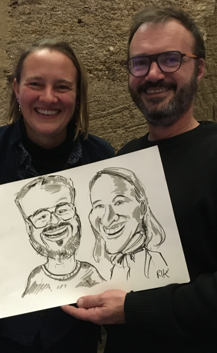 Avec son chevalet portatif, Rik propose à vos invités de se faire croquer. Les portraits réalisés sont humoristiques mais l'exagération reste douce, le style s'approchant plus de la bande dessinée que de la caricature traditionnelle. L'ensemble des dessins est ensuite exposé à un fil tendu dans la pièce de réception, laissant à chacun le loisir de se promener quand il veut pour découvrir l'interprétation qu'aura fait l'artiste du visage de son proche ou de son collègue. Cette animation conviviale invite à la bonne humeur et ajoute une petite touche de légèreté à votre événement. A la fin de la fête, chaque modèle repart avec son portrait en guise de souvenir.