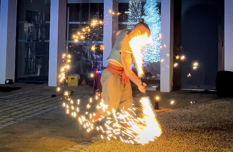 Spectacle de feu et pyrotechnie, avec machine à bulles et intro narrative.