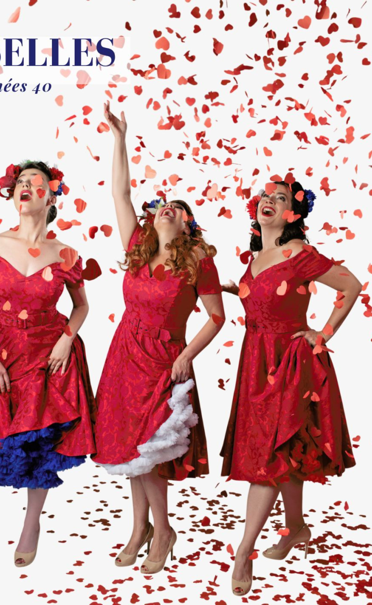 Notre trio de chanteuses accompagnées de 3 à 6 musiciens et d’un couple de danseurs vous proposent un répertoire qui a marqué les années 40 comme Duke Ellington, Glenn Miller… et rendent un hommage tout particulier aux Andrews Sisters, à leur harmonie vocale exceptionnelle et leur énergie contagieuse qui ont laissé une empreinte indélébile dans le monde de la musique.