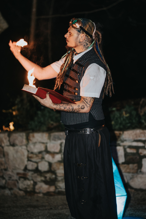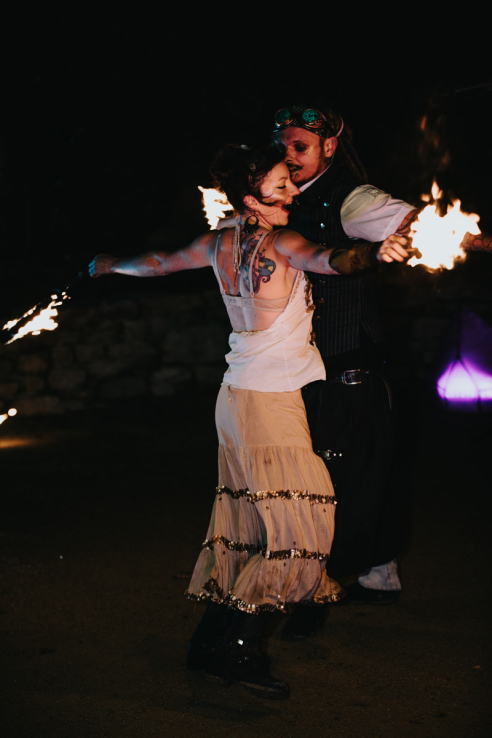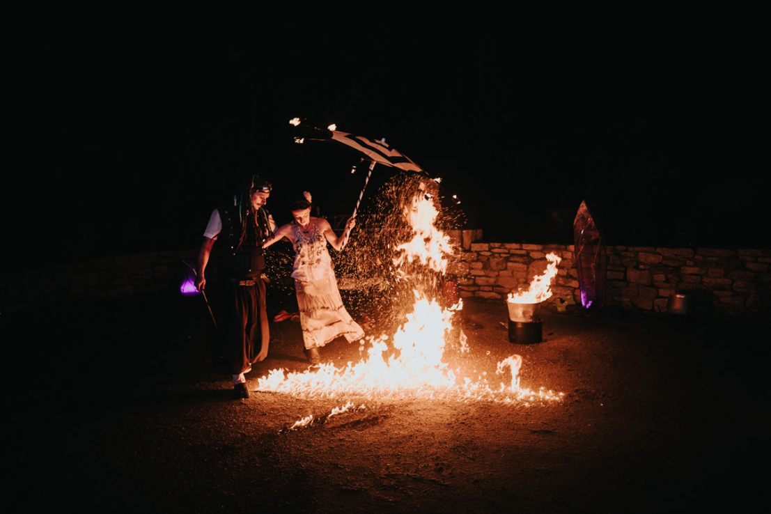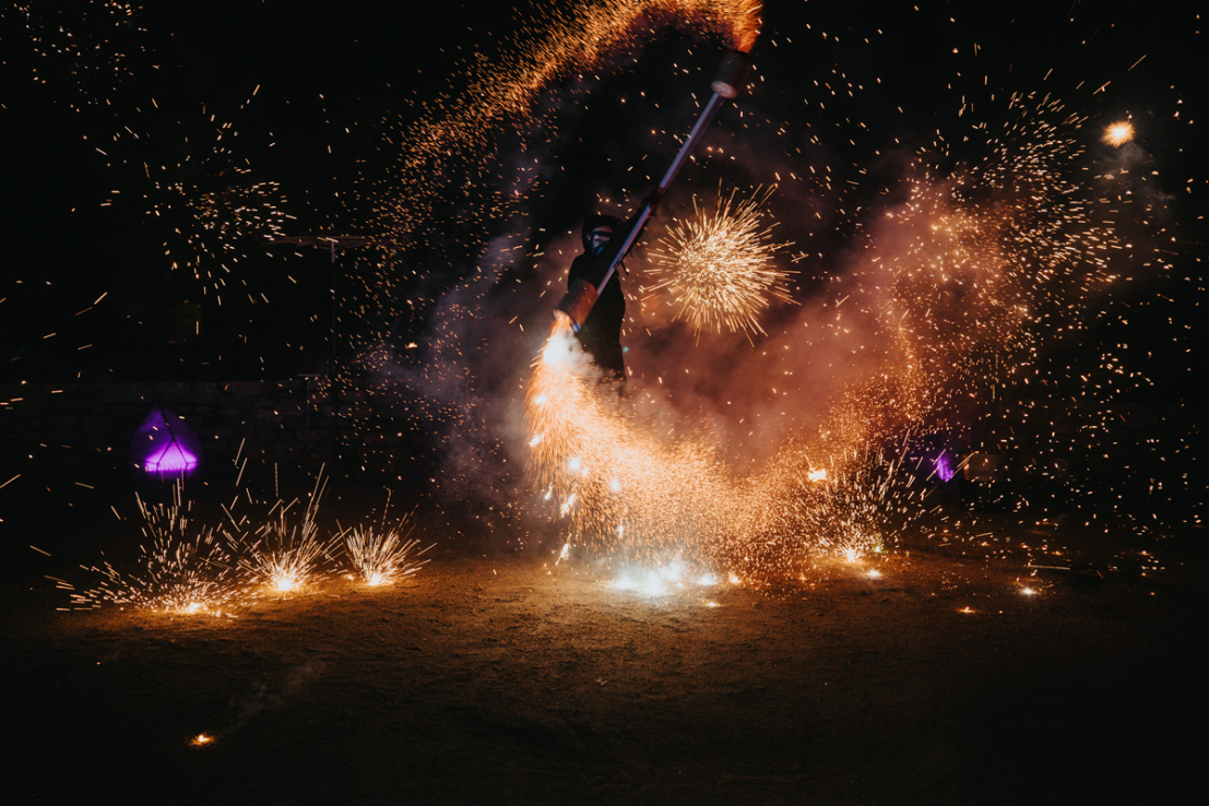 Animation pluridisciplinaire de jongle et danses enflammées, pyrotechnie et autre effets lumineux, en musique.