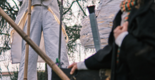 Spectacle et déambulation plus intimiste. 3 comédiens dont deux échassiers. Un spectacle pour un public "captif", des temps fixes et des déplacements. Représentable en après midi mais préférable en soirée (coucher du soleil).