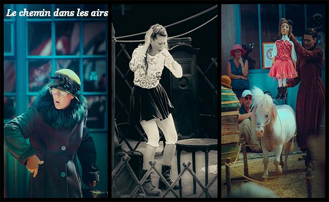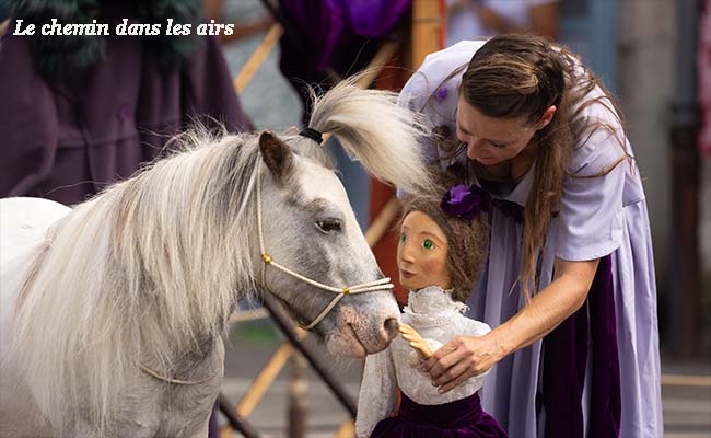 "Le chemin dans les airs" C'est un conte initiatique, qui mélange la complicité équine et la marionnette dans un univers de film muet. Le tout saupoudré de poésie, de magie, de rires. Petit et grand s'y retrouverons.