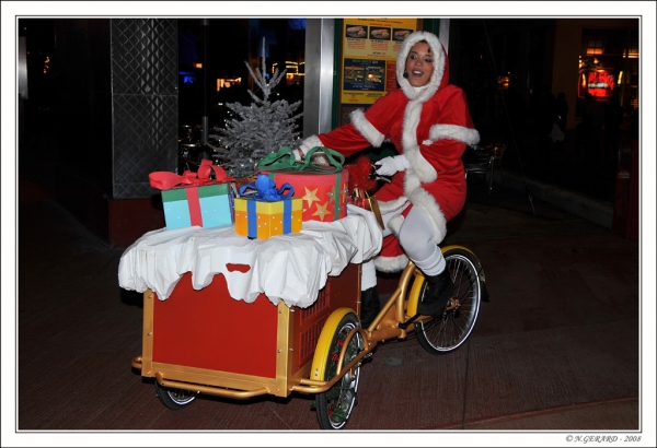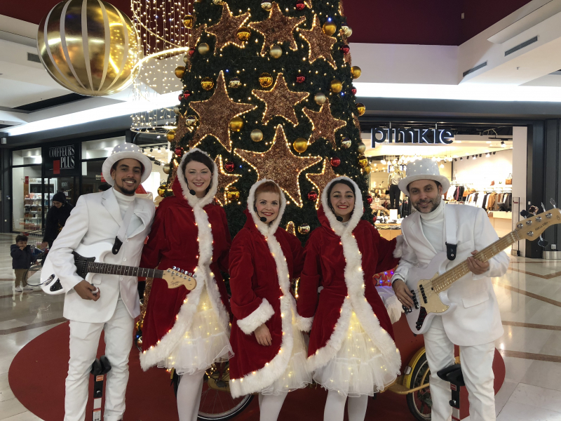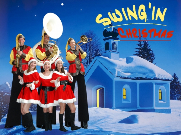 Quand 2 lutins musiciens rencontrent 3 mères noël chanteuses percussionnistes, ils créent “Swing’in Christmas” :les lutins sur gyropodes donnent l'impression de voler, les mères noël dans leurs costumes lumineux et sur leur triporteur de noël se promènent en chansons de Noël d’ici et d’ailleurs, en formant un petit théâtre ambulant au milieu des petits et des grands.