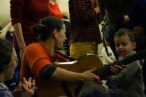 Les musiques se font également plus douces que dans le « bal des grands » : 2 ou 3 musiciens viennent chatouiller les oreilles des tout-petits avec guitare, violon, piano ou accordéon, et, tous ensemble, on chante, on danse, on joue…