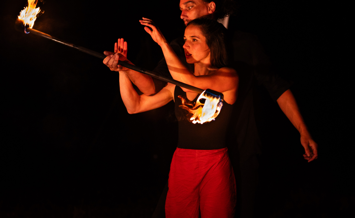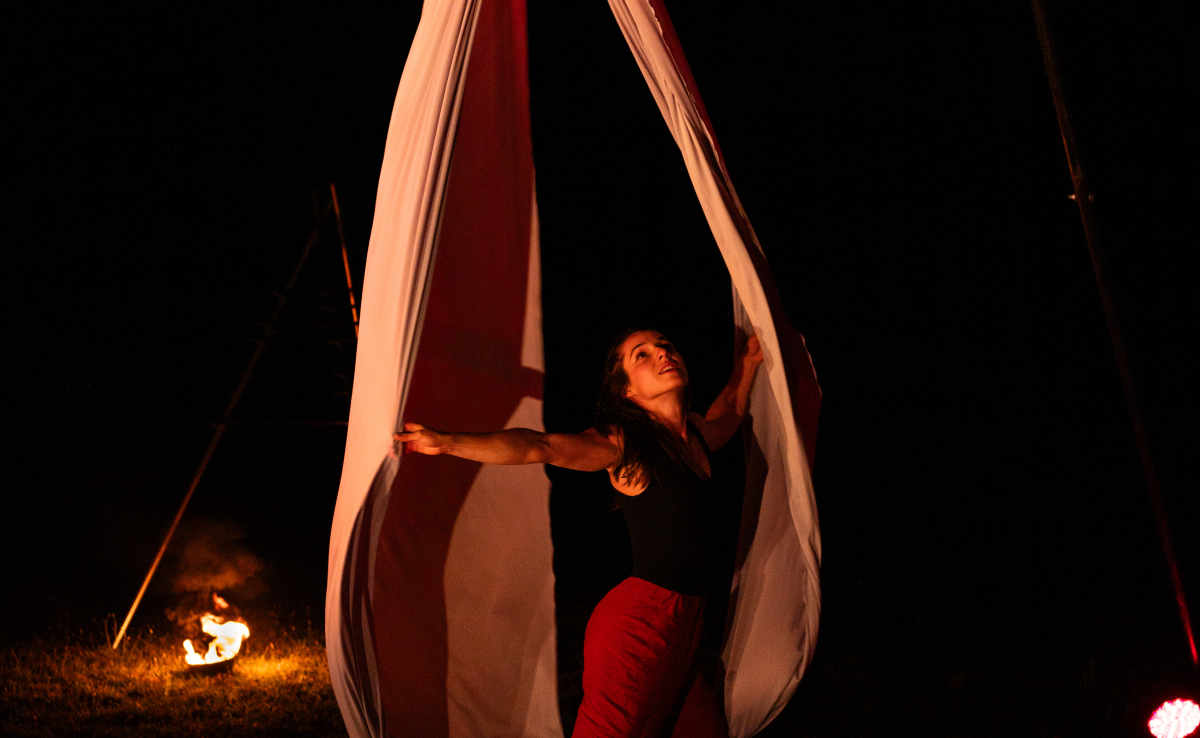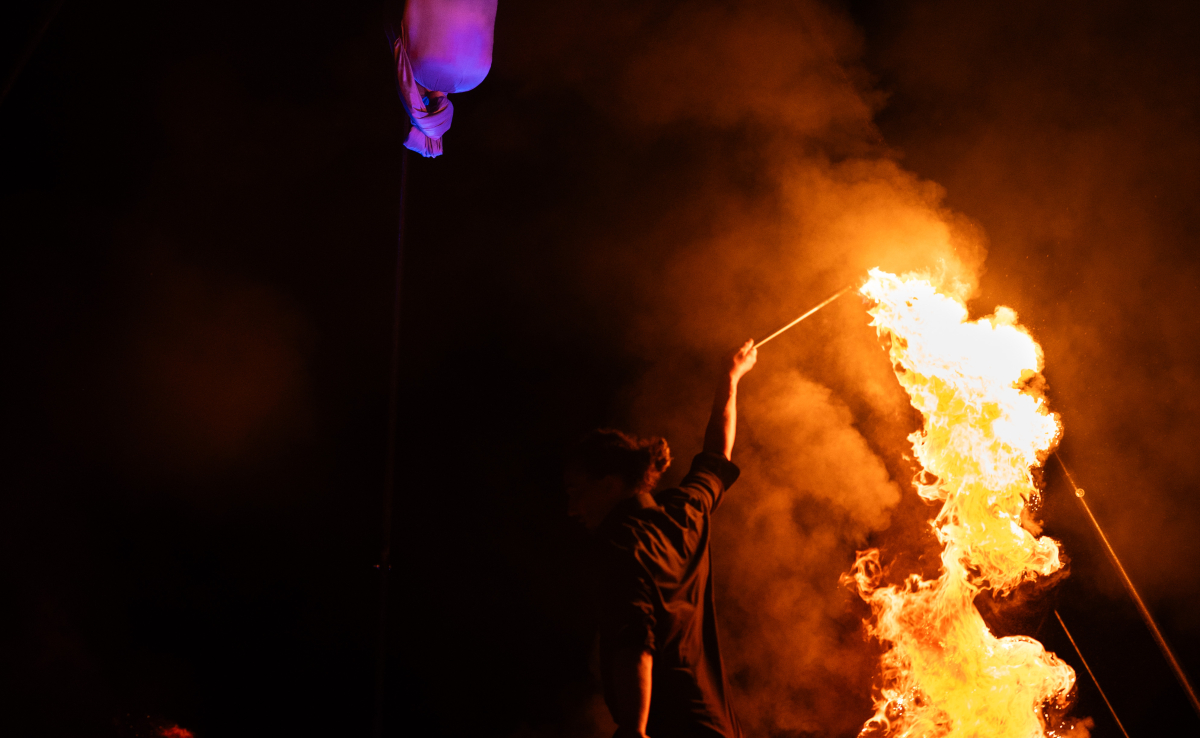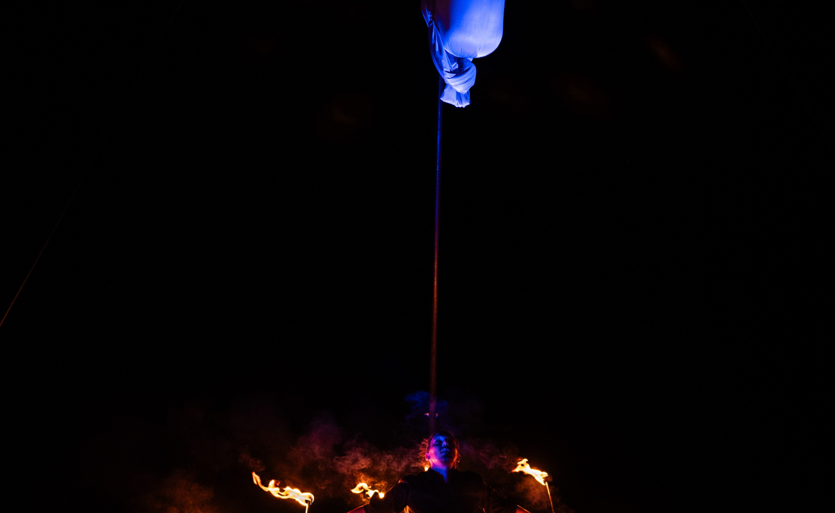 Les flammes dansantes illuminent la scène, évoquant la chaleur de la métamorphose intérieure, tandis que l'acrobate aérienne se balance avec grâce et légèreté, symbolisant l'envol vers de nouveaux horizons. Au son envoûtant de la musique, chaque mouvement est une poésie visuelle, chaque geste une invitation à l'émerveillement et à la contemplation.