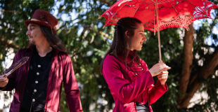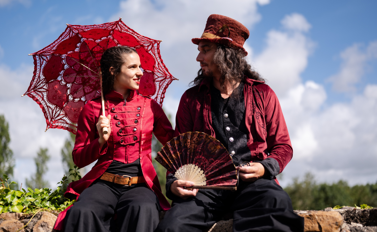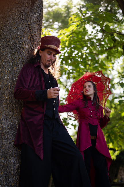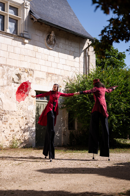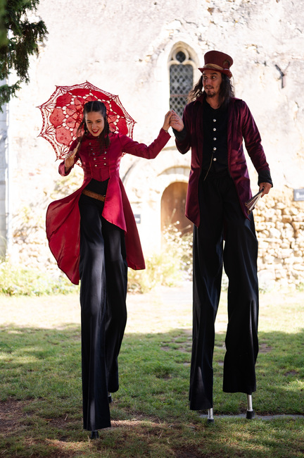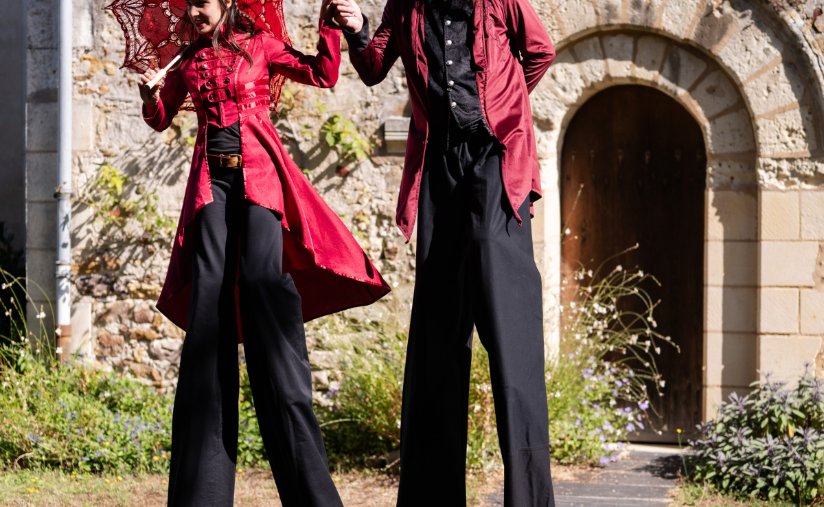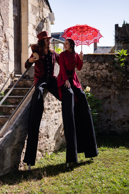 Dans les rues animées, une scène d'un autre temps se dévoile : une déambulation en échasses "la Belle Époque". Les artistes, gracieusement perchés sur leurs échasses, évoluent avec une élégance naturelle qui rappelle les salons distingués de cette période fastueuse.