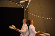 Techniques de cirque présentés: équilibres sur échelle libre, monocycle, jonglerie balles en solo et massues en duo.