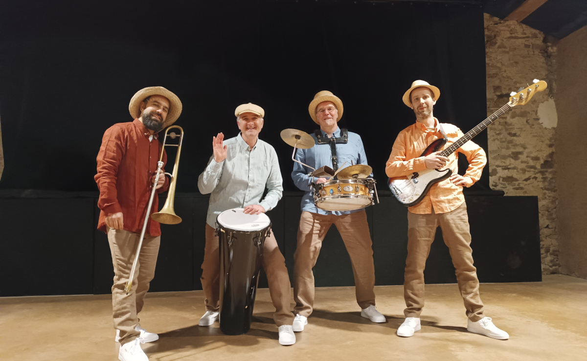un tromboniste, un bassiste, un caisse clairiste et un joueur de timba.