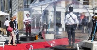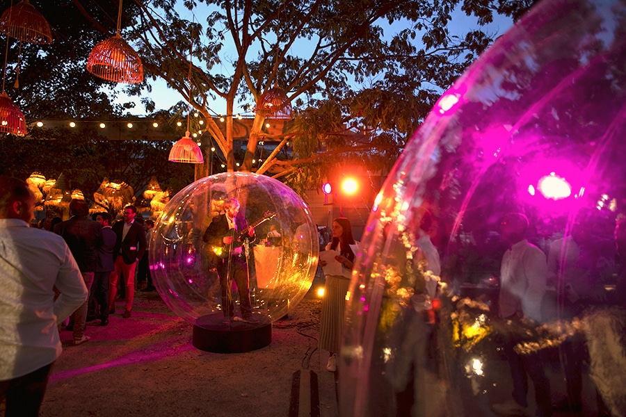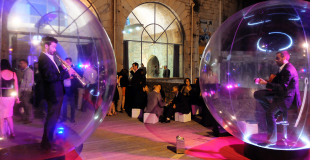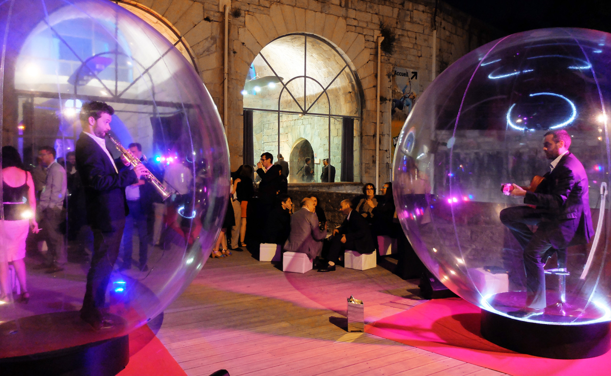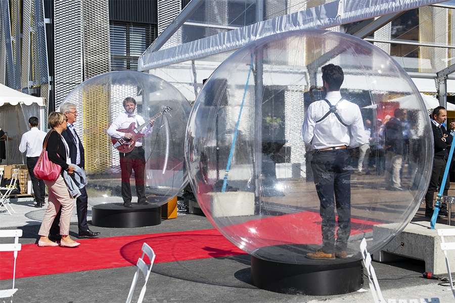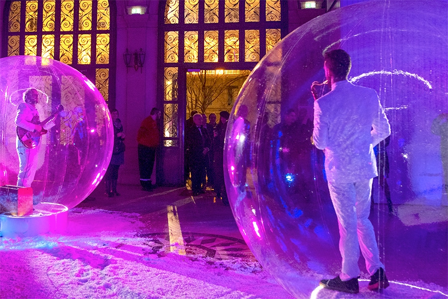 Deux bulles transparentes dans lesquelles se nichent des musiciens performers live pour apporter un raffinement unique à vos évènements.
