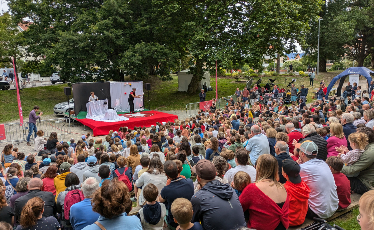 En effet, les enfants ne viennent jamais seuls à une représentation, aussi dans toutes les histoires très visuelles qui s'adressent aux enfants à partir de 3 ans jusqu'à 12 ans et plus, une seconde lecture, et de vrais numéros de cirque et de magie, ne laissent pas les accompagnateurs indifférents.