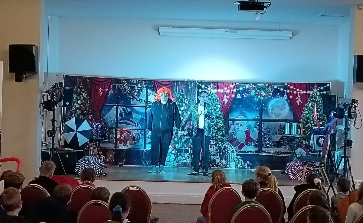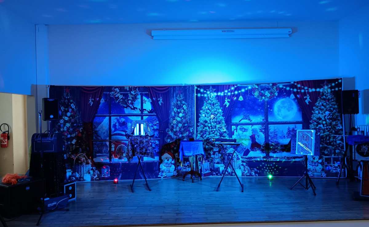 spectacle avec décore de scène thème noël et de nombreux costumes