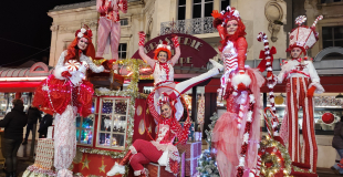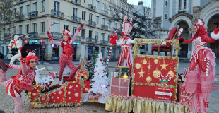 Les Elfy sont accompagnés des échassiers Alizarines, vêtus de costumes rouge et blanc, qui se déplacent avec grâce et élégance, leurs longues silhouettes dansant au rythme des musiques de Noël diffusées tout au long de la parade. Leur hauteur impressionnante et leurs tenues élégantes ajoutent une touche spectaculaire et poétique à ce tableau festif.