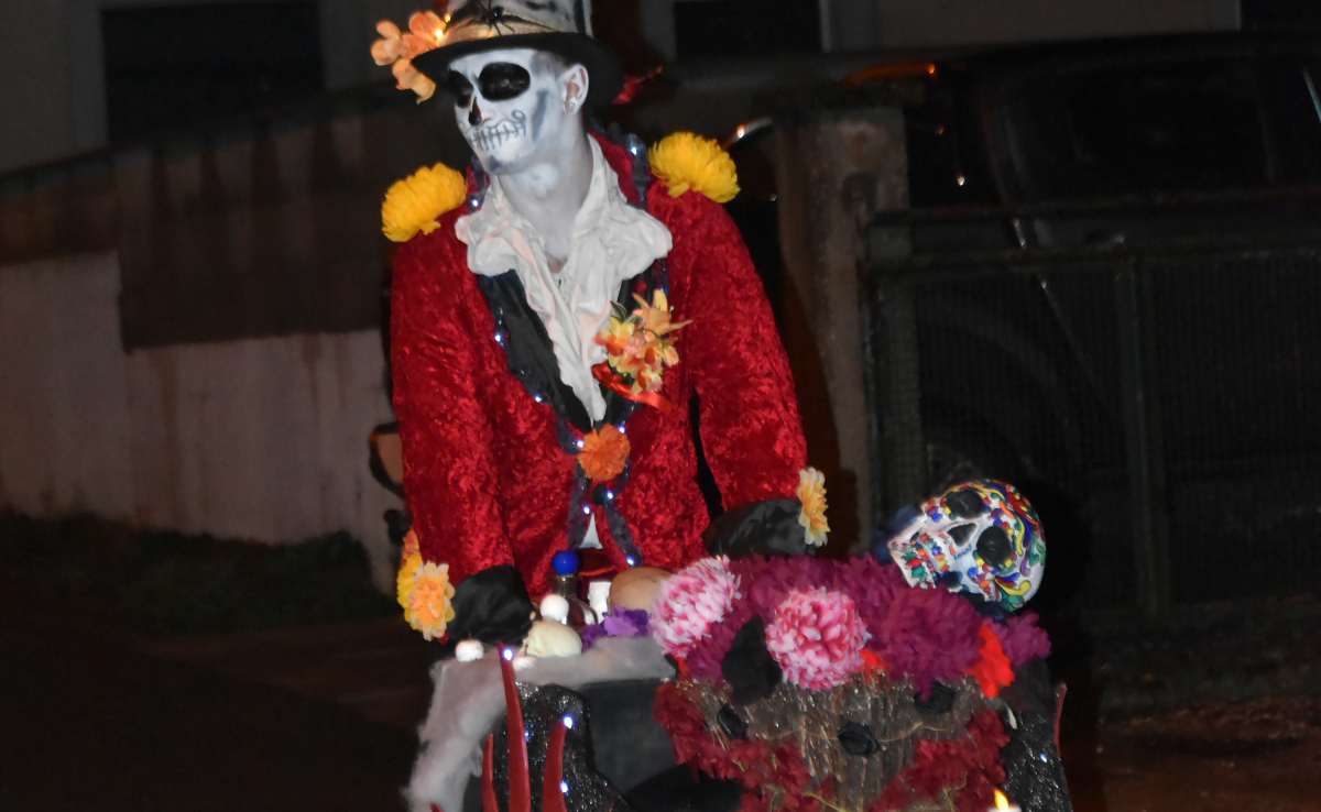 Leur danse est rythmée par un char macabre, poussé par un personnage mort-vivant, espiègle et festif. Les sons envoutants de la musique mexicaine et de la salsa cubaine se mêlent à l'ambiance mystérieuse de la fête d'Halloween.