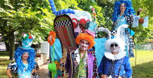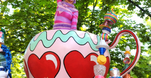 Au centre de ce cortège enchanteur, un char monumental, véritable explosion de couleurs, avance majestueusement tel un rêve démesuré. Sur son plateau, la scène de thé prend vie avec une table géante où des pyramides de tasses et théières et les accessoires délurés créent une atmosphère surréaliste.