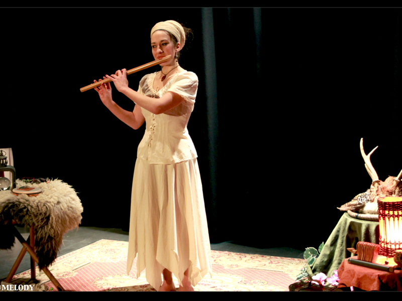 Mélody vous conte l'histoire de Jean la trouille sous les notes fantastiques de des instruments de musique ( hang, flûtes en cornes, harpe de cristal ) sa magie et sa jonglerie de cristal. Lorenzo l'accompagne en peignant une fresque aux illustrations chatoyantes.