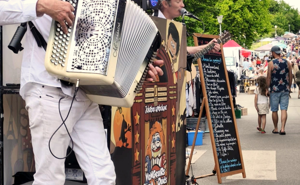 Interactif, il est rapide à mettre en place et se déploie d'un endroit à l'autre de votre manifestation. Vrai pourvoyeur de sourire musical, le public choisit sur panneau sa chanson française des années 1930 à nos jours. Sous le Flon-Flon survitaminé de l'accordéon et la guitare swing énergique, le Jukebox humain la reprendra en live pour chanter et danser avec nos acolytes !