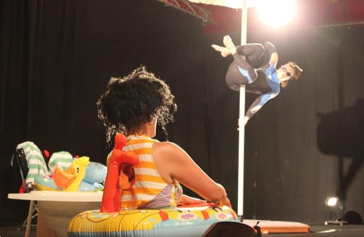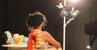« The Two WOWmen SHOWer » c’est la rencontre entre Paula Malik, artiste clowne colombienne, antipodiste, exploratrice d’émotions & Camille Roquencourt, qui défie la gravité sur les mains ou sur un mât.