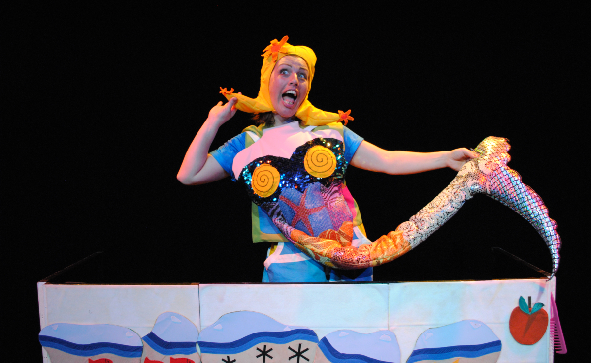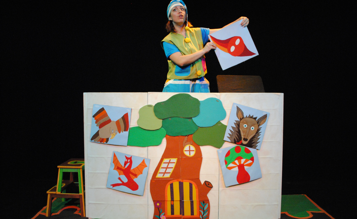 Le décor est comme un puzzle qui se construit devant les enfants. Selon l’histoire, le comédien change de lieu et se transforme en personnages merveilleux : serpent, fée, nain, feu follet, sirène, oiseau de feu…